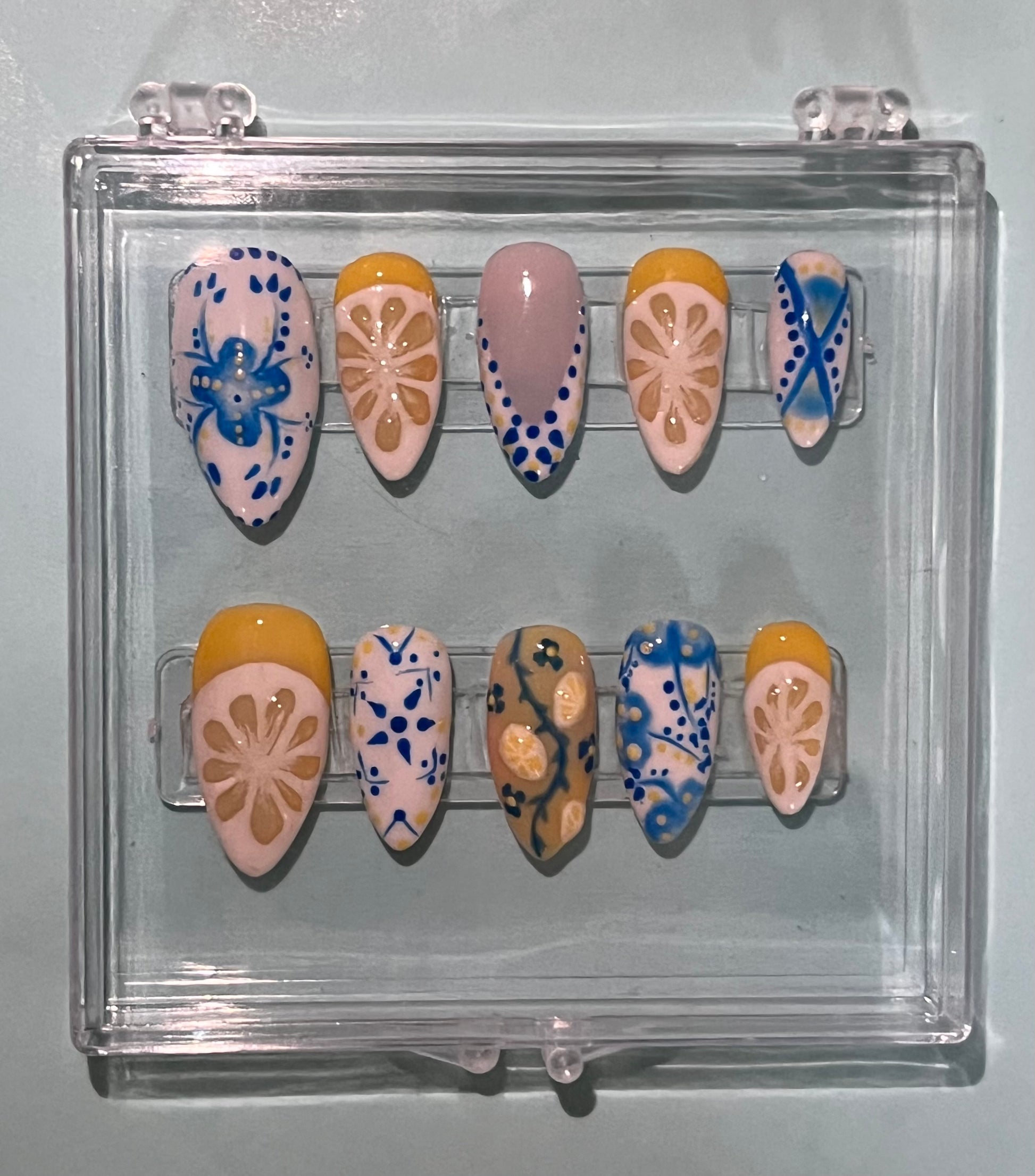 Hållbara och snygga press on naglar med citron och porslin mönster.