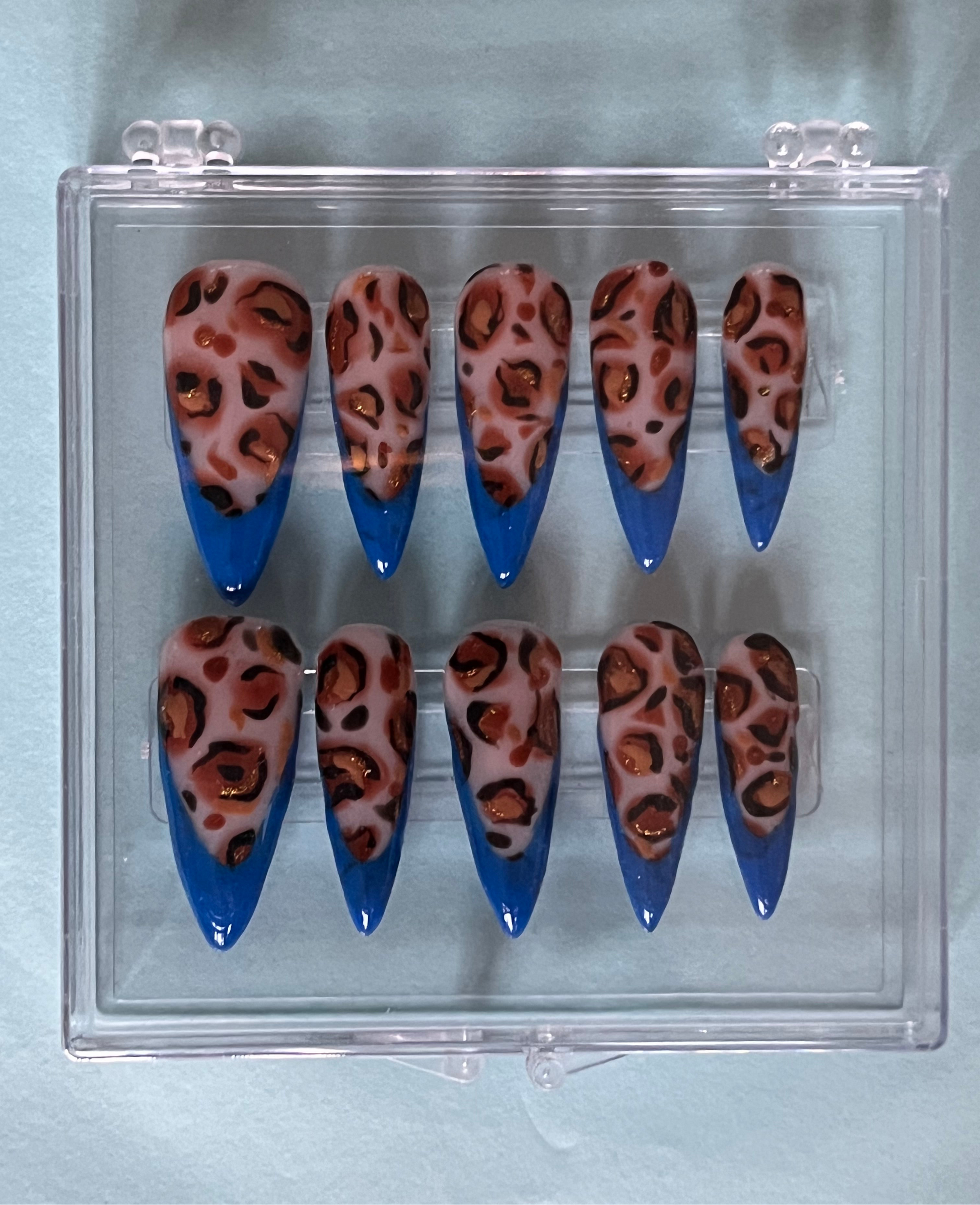 Hållbara och snygga press on naglar med leopard mönster och en blå fransk kant.